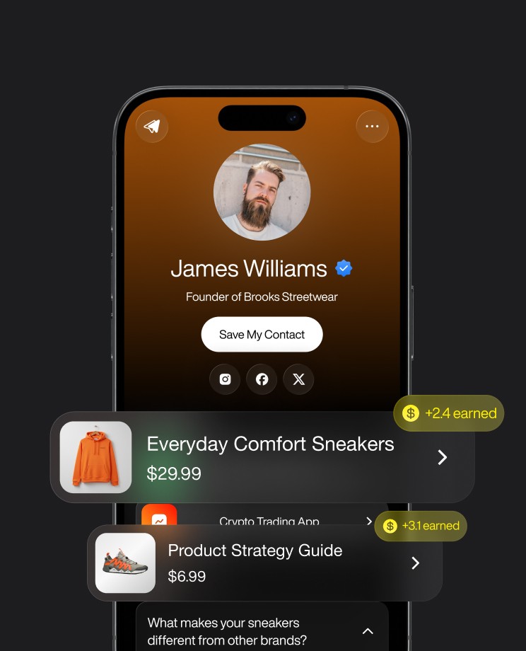 and links — everything monetized in one AI-powered link-in-bio.
