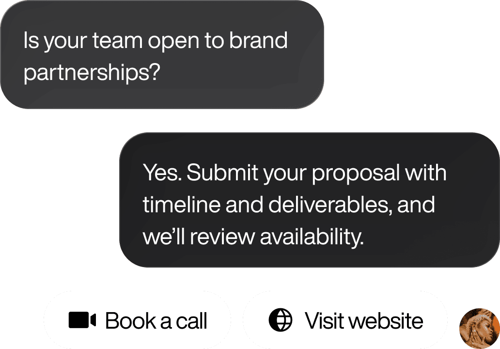 Your AI clone is trained on your public persona, career highlights, brand voice, and product catalog. Fans can interact with it anytime — asking about your journey, getting content recommendations, or learning about upcoming releases and offers. The clone engages fans who might otherwise never get a personal interaction with you, turning passive followers into active buyers. It's available 24/7, handles unlimited simultaneous conversations, and always stays on-brand because it's grounded in your approved content.